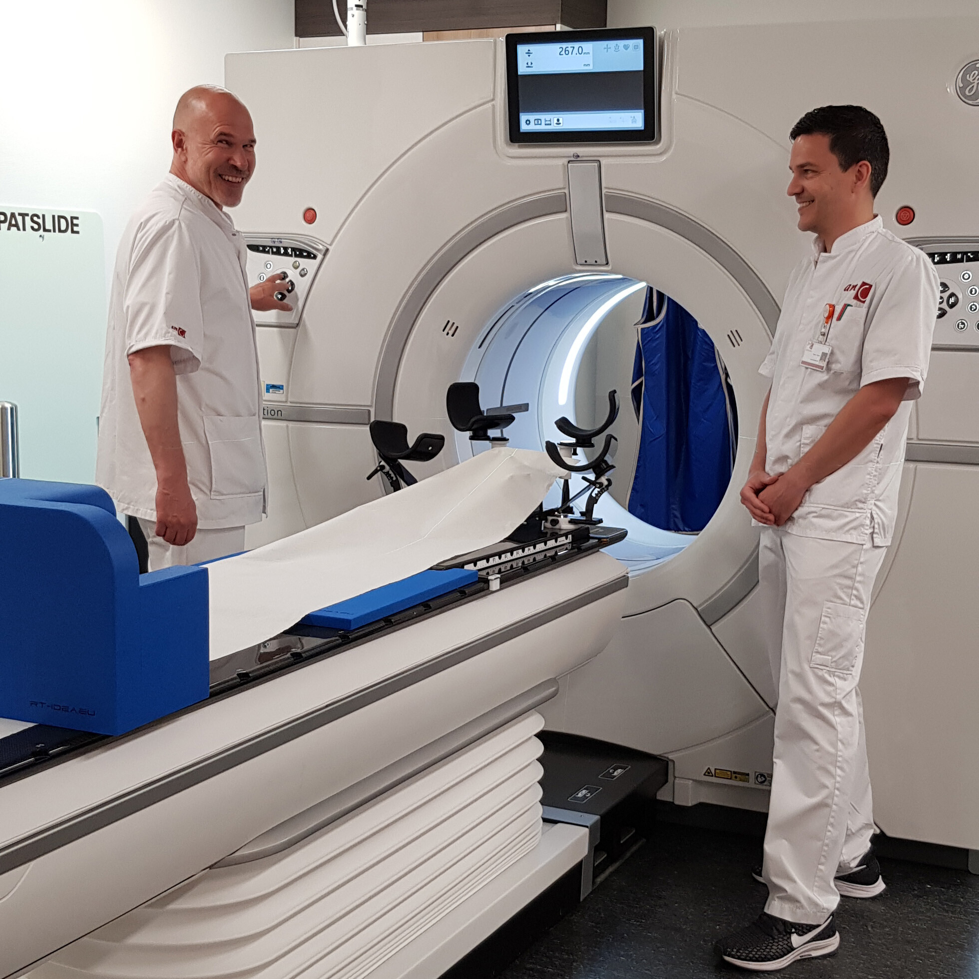 We zijn een innoverende afdeling en werken met de meest geavanceerde behandeltechnieken. Zo hadden we in 2018 een wereldprimeur door de eerste patiënt te bestralen op een hybride systeem die bestaat uit een MR scanner en een lineaire versneller, waarbij gebruik is gemaakt van een ‘online adaptieve workflow’. Deze online adaptieve workflow wordt nu verder uitgebreid door de aanschaf en installatie van 6 ETHOS versnellers.