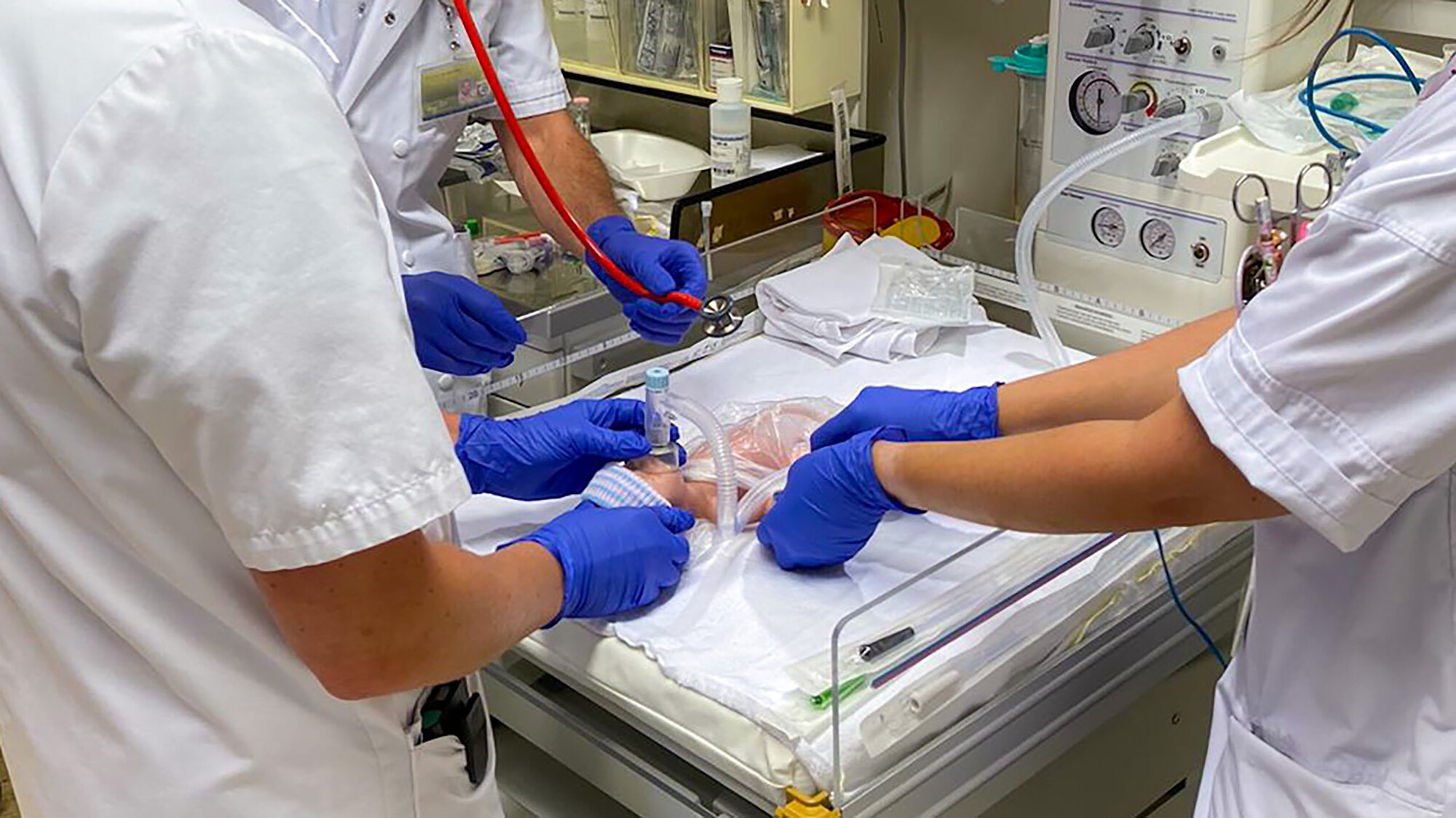 Kort stellen we ons voor en dan gaan we aan het werk. Ondanks dat dit meisje onvoorbereid is geboren, dat wil zeggen dat er geen tijd is geweest om moeder een injectie te geven om de longrijping van de baby te stimuleren, ademt zij dapper zelf. We ondersteunen haar ademhaling en zorgen ervoor dat ze een infuus krijgt voor glucose toediening. Ouders kijken op een afstandje toe. Een verpleegkundige staat bij hen en ik hoor haar elke stap die we uitvoeren uitleggen. Na het toedienen van verschillende medicamenten zijn we er klaar voor om dit kleine meisje te vervoeren naar onze eigen afdeling.