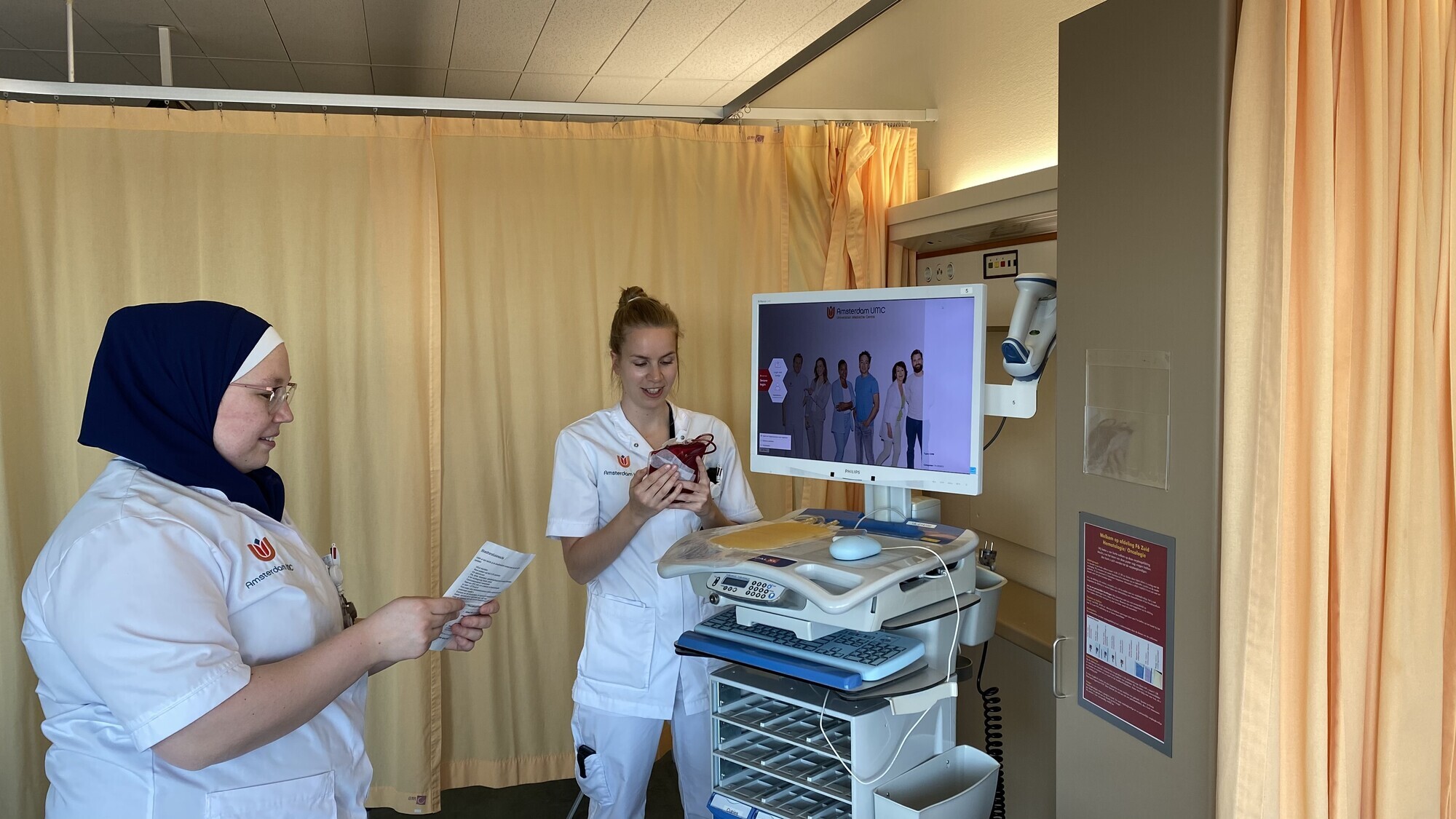 “…bij ons op de afdeling komen patiënten vaak voor een heel traject van behandelingen. Bijvoorbeeld als iemand de diagnose leukemie heeft gekregen. De behandeling daarvoor bestaat uit meerdere kuren vaak gevolgd met een stamceltransplantatie, daarom worden patiënten voor langere periode opgenomen en keren ze daarna ook meermaals terug op de afdeling. Hierdoor bouw je een band op met elkaar.” Vertelt Jamie. “Dat klopt,” zegt Merel. “De afdeling is persoonlijk, de patiënten zijn hier geen nummer.”