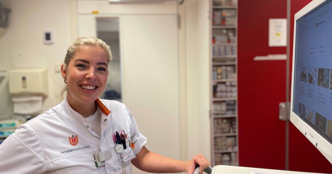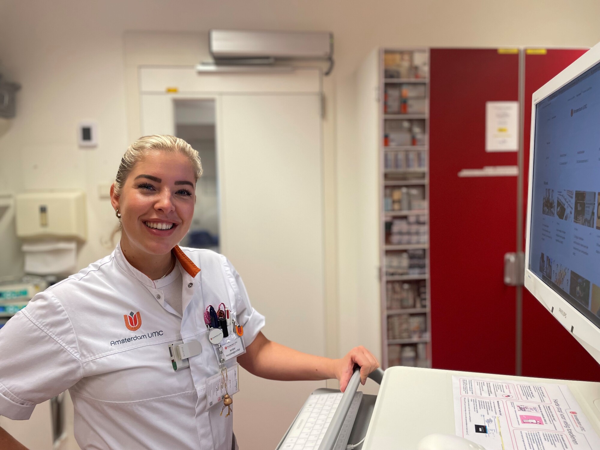 “Mijn eerste kennismaking met Amsterdam UMC was tijdens mijn studie Verpleegkunde hbo-v werken/leren. Een duaal traject waarin je al vanaf je tweede jaar aan het werk gaat bij Amsterdam UMC en je je werk afwisselt met leren. Ieder jaar biedt Amsterdam UMC zo’n 15 van dit soort plekken aan, op in mijn geval 300 aanmeldingen. Ik denk dat ik uitgekozen ben omdat ik al ietsjes ouder was, 23 toen, en al heel goed wist wat ik echt wilde.”