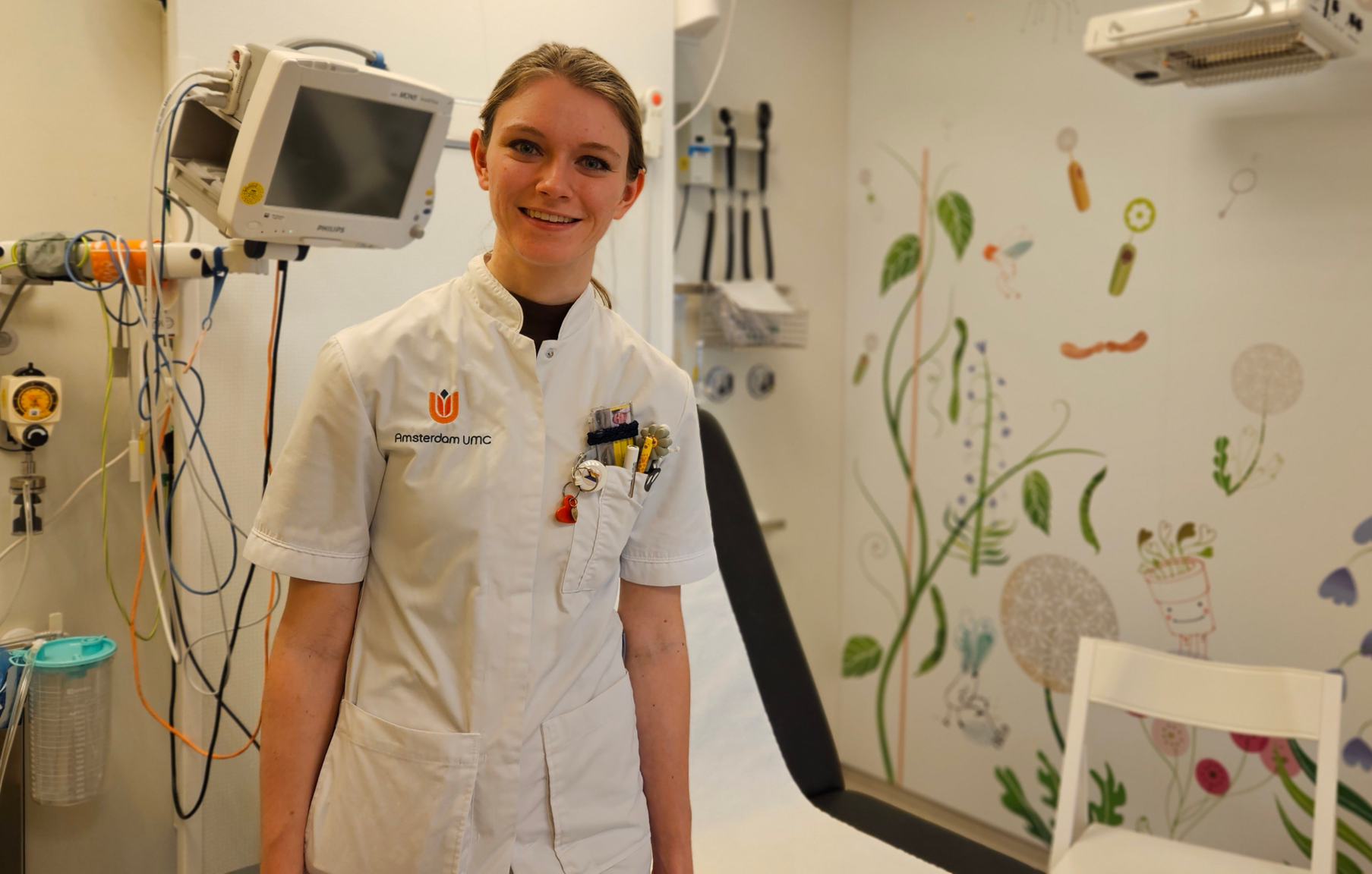 “Met kinderen werken is vaak een stuk ingewikkelder dan met volwassenen. Denk bijvoorbeeld aan een handeling als het meten van iemands bloeddruk. Bij de meeste volwassenen doe je dat wel even, maar bij een kind is dat een compleet ander verhaal. Niet alleen vinden kinderen het vaak al heel spannend om zo’n bloeddrukband om hun bovenarm te krijgen, ze moeten ook nog eens superstil zitten om een correcte meting te kunnen krijgen. We doen die meting dan ook alleen als het echt noodzakelijk is en dan bijvoorbeeld in iemands slaap. We zijn constant bezig om creatieve oplossingen te bedenken voor medische handelingen die op papier heel simpel lijken. Ons in het kind te verplaatsen en handelingen op hun niveau uit te leggen en vervolgens een spel te maken van bijvoorbeeld het meten van iemands ademhaling en hartslag. Ook het schakelen tussen de verschillende leeftijden vraagt om creativiteit en flexibiliteit. De ene keer begeleid en werk je samen met ouders in de zorg voor hun baby. De andere keer probeer je een kind rustig te krijgen voor een echo. Iedere leeftijdscategorie vraagt om een andere benadering en andere zorg.”