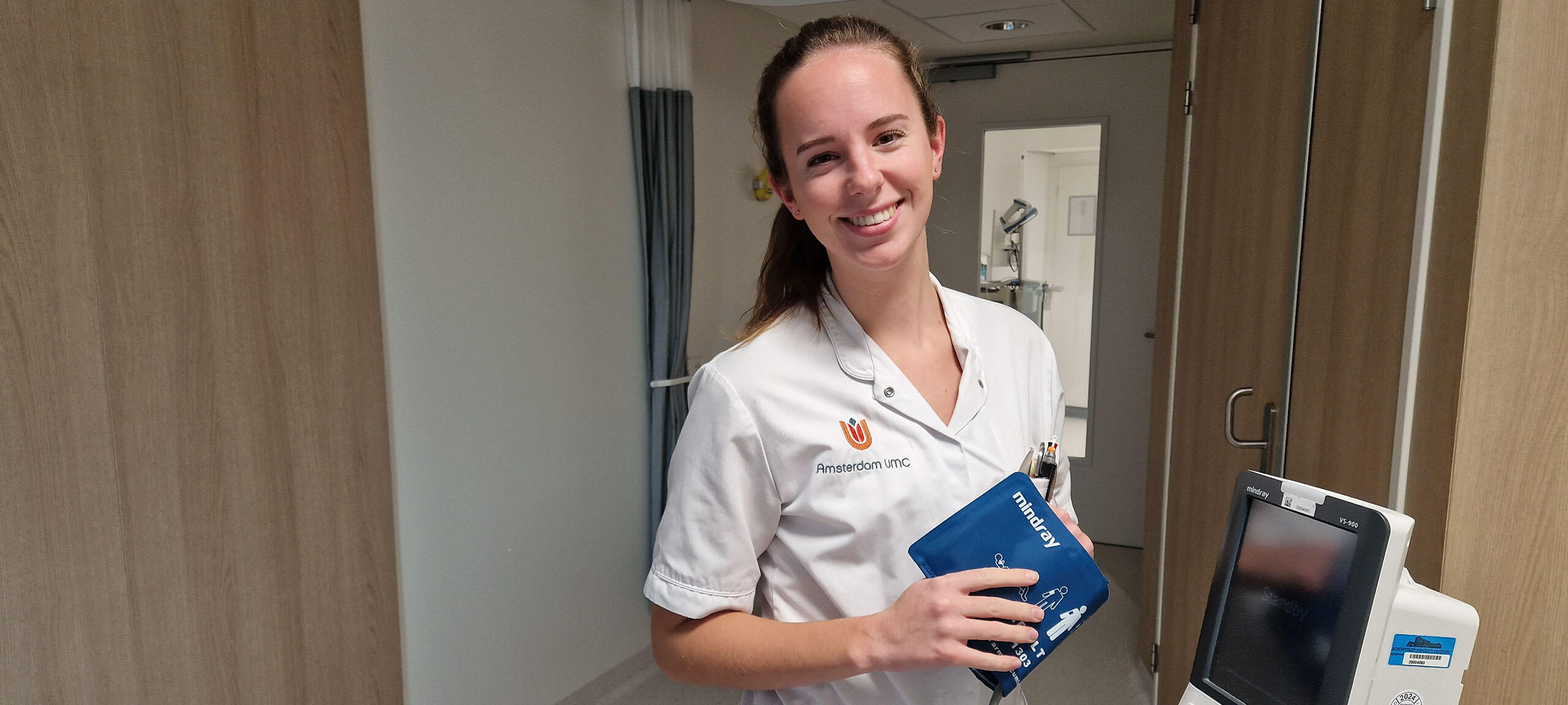 'Ik wilde na mijn MBO-V graag aan de slag in een klinische omgeving. Tijdens mijn studie kon ik alleen geen stagelopen in een ziekenhuis. Hierdoor was het voor mij erg moeilijk om een baan in een ziekenhuis te vinden, omdat klinische ervaring hier verplicht is. Ik heb toen gevraagd of ik een dag mee kon lopen op de afdeling urologie/genderzorg van Amsterdam UMC. Zo is het balletje gaan rollen en kwam ik uiteindelijk bij het Verpleegkundig Oriëntatie Programma terecht, welke speciaal in het leven is geroepen om verpleegkundigen deze ervaring te geven.’